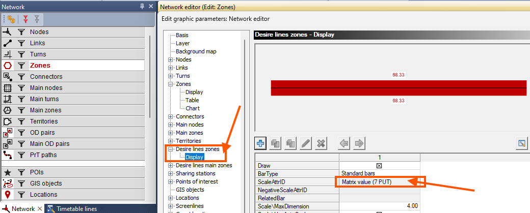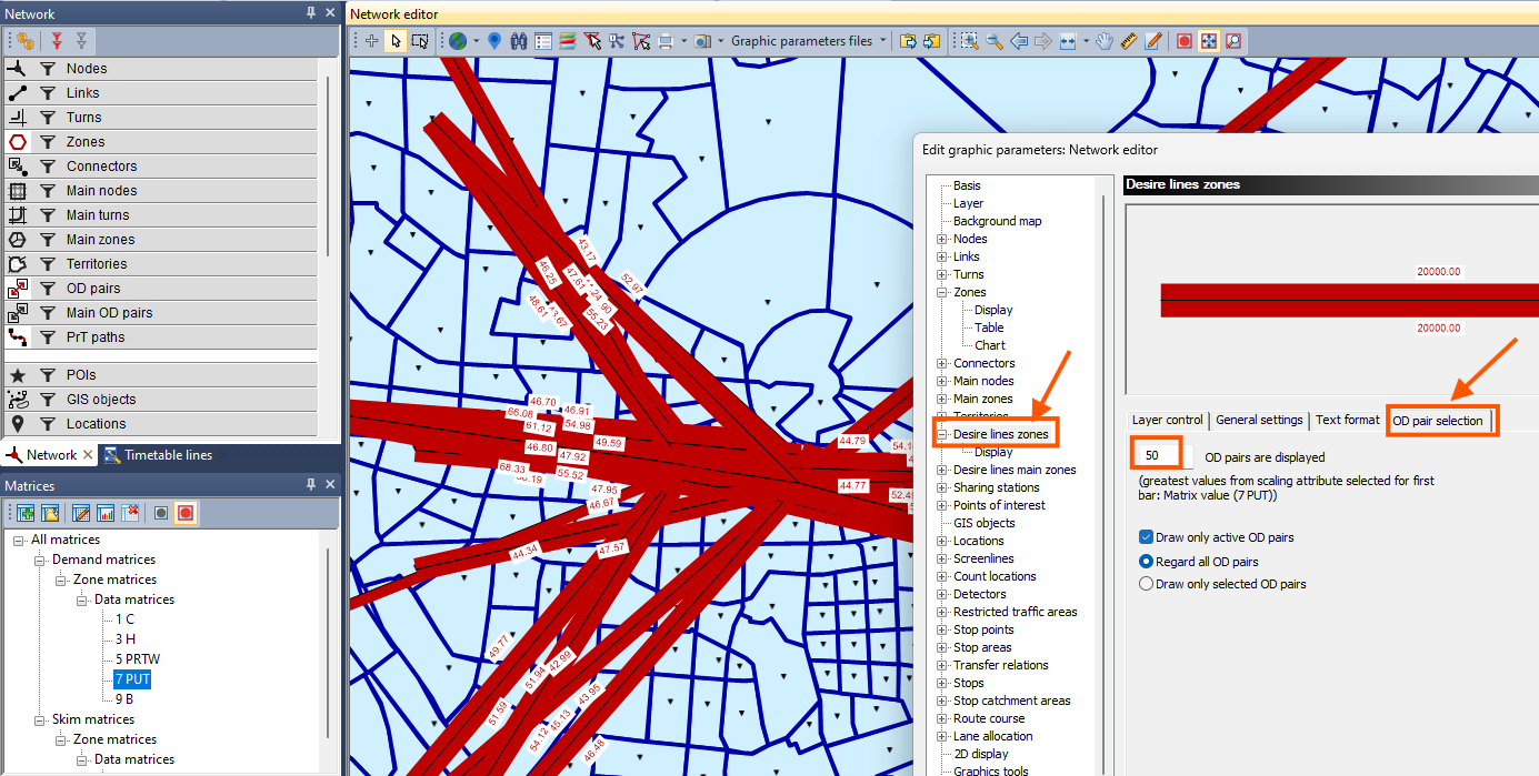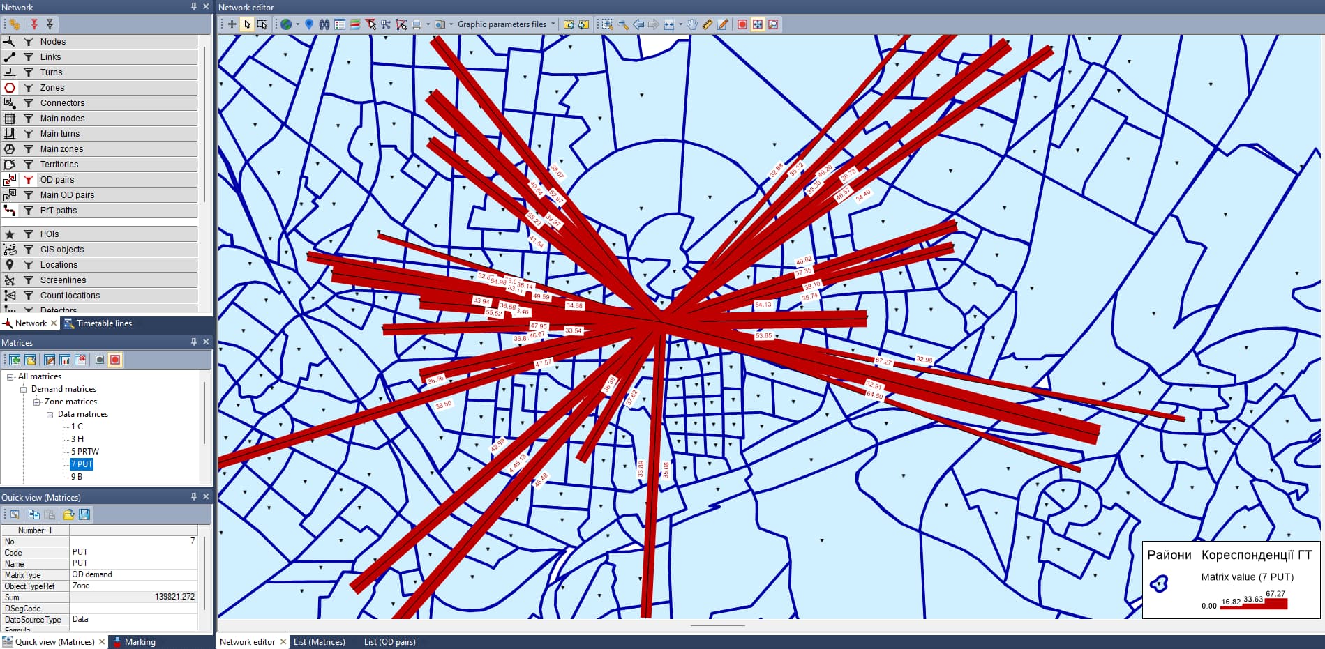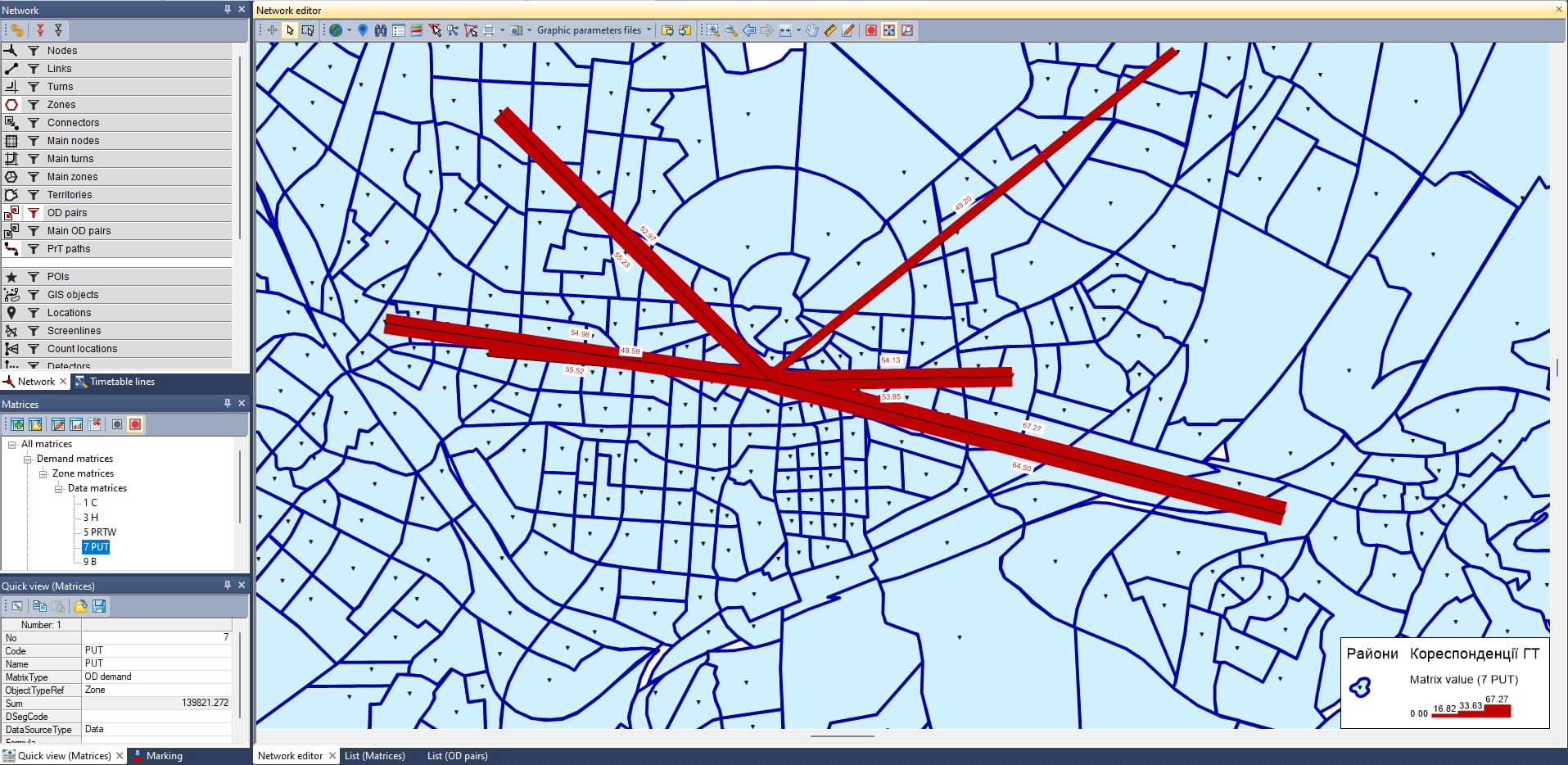 - Налаштовуємо візуалізацію для елемента мережі - Пари кореспонденцій (OD pairs / Diser lines zones) та обираємо потрібну матрицю для відображення.